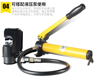 6、分離式壓接鉗的特性:可采用手動式、電動式和汽油發動機單動式液壓油泵浦;規格小、很輕,非常合適在高處和室內空間窄小的地區工作 ;磨具購買:同EP-431、EP-510C;